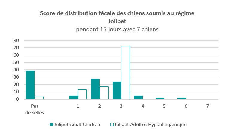 En outre, l'étude de l'Université de Gand a également montré que la consistance des matières fécales était très bonne. Dans un système de notation fécale souvent utilisé, le score 1 est considéré comme trop dur et le score 7 comme une diarrhée aqueuse. Un score de 2 est idéal. Les deux aliments Jolipet testés ont obtenu un score de 2 ou 3 presque à chaque fois (52 % des jours dans le cas de Jolipet Adult Chicken ; 89 % dans le cas de Jolipet Adult Hypo). Et ce qui est le plus frappant, c'est qu'il y a eu de nombreux jours sans selles (presque 40 % des jours de test dans le cas de Jolipet Adult Chicken). Mais ce n'est pas surprenant étant donné le niveau élevé de digestion.