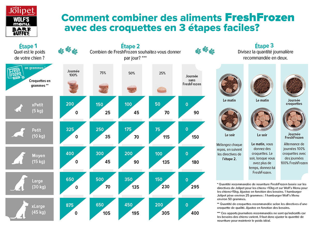 Il s'agit d'un choix personnel. Certains optent directement pour une alimentation 100 % FreshFrozen, d'autres préfèrent une alimentation composée de 50% FreshFrozen et 50% croquettes sur une base quotidienne, et d'autres encore choisissent d'ajouter des aliments fraîchement surgelés comme une sorte de plat d’accompagnement sain aux croquettes et de donner 25 % de FreshFrozen par jour. Et si vous n'avez plus de nourriture FreshFrozen, ce sera un jour sans viande.