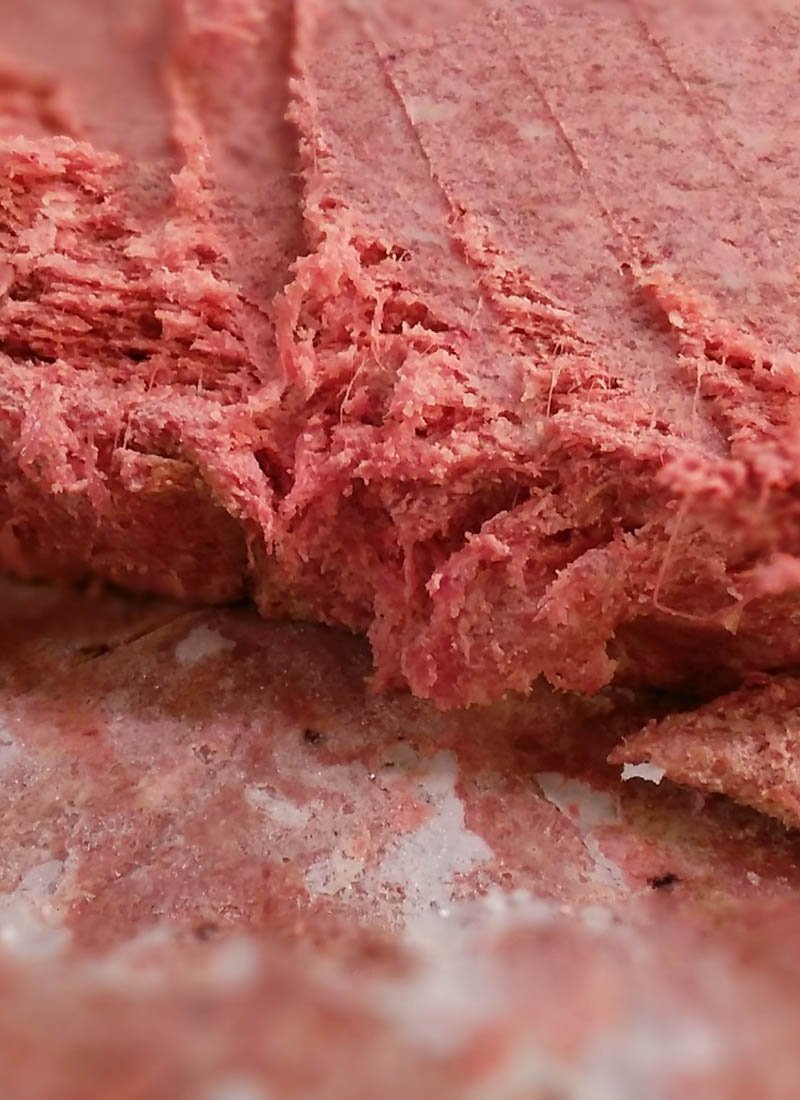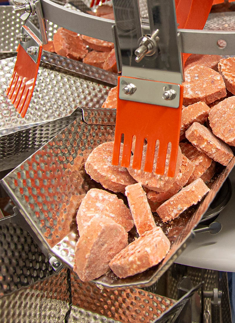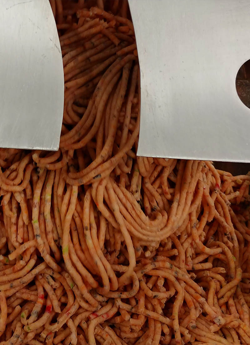 Het merendeel van het vlees dat we gebruiken is van humane kwaliteit tot op het moment dat het naar onze fabriek moet vertrekken. Dan krijgt het de bestemming ‘dierenvoeding’. Onze slagers gebruiken geen laagwaardig slachtafval (v.b. poten, pluimen) of goedkope vullers (vb. maïs, tarwe).